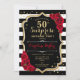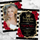 Elegant blommigt feminin överraskar 50-årsdagen med ditt foto på baksidan av kortet. Glam svartvit design med faux glitter guld. Innehåller svart och vitt rand, röd ros, skript och konetti. Perfekt för en snyggt vuxen under firande party. Anpassa med dina egna detaljer. Kan anpassas för vilken ålder som helst! Skrivna Zazzle-inbjudningar eller digital utskrivbar mall för omedelbar nedladdning.