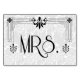 Du kan anpassa all text på denna svartvita konsthög i stil 20-talet (20-talet, 1920-talet) glamorös och ritzisk personlig till ett överkomligt pris, bröllop Mrs Card. Du är menad till ställe den här på baksidan av brudens stol. Vanligtvis är det upphängt med band eller tyg. Konstruktionen har en svart konst deco ram på vit bakgrund med en blommigt damm stil mönster överlägg i baksidan. Det finns ett Mr-kort att följa med med för brudgummen.
