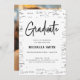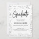Matematikinbjudan i svart och vit elegant med bakgrund av matematiska formler och ekvationer och ett ställe för att lägga till fotot i student baksidan. Illustrerad och designad av Patricia Alvarez.