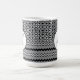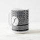 Den översta delen av mugg är täckt med en upprepande retro-medallion mönster med konkavande diamantformer inuti, och grund har rader med zigzagor av olika tjocklek. Över de centrala områden där mönster möts finns en vit medaljon med en svart och vit prickad gräns. Över det är ett utrymme för ditt monogram. Byt brev till spelar ingen roll som du vill. Du kan också ändra monogramets typsnitt om du vill.
