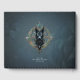 Svart varar huvud med piercing blå ögon, mot en cirkulär, ornerad bakgrund. Bakgrunden är en komplex utformning av guld och iridscent mönster, som liknar en magisk symbol. Vargens päls är detaljerat med krånglig linjer och skuggning, ge en mystisk och kraftfull närvaro.