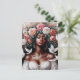 This floral postcard features a hyperfeminine artwork of a gorgeous black woman adorned by large, blooming flowers and surrounded by doves. Her eyes are closed in a serene expression, and she wears a peasant-style white dress. The melanin-rich dark brown-skinned beauty could be African-American, Afro-Latina, Caribbean, Afro-British, etc.