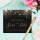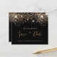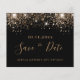 Ett giftigt och trendig Spara datumkortet för en 40:e (eller någon annan ålder) födelsedagsfest. En svart bakgrund dekorerad med faux guld glitter. Mallar för datum och namn och text. Golden färgad brev. Texten: Spara datumet skrivs med ett stort trendig-handskript i stil.