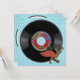 Kvadratisk pärlshimmer med en bild av en 50-sekunders Sten & Roll-45 rpm-post och en vintage bild av Jitterbug-dansare på bakgrundsblått polka dots på blå. Posten heter "Bop "Til you Drop (Vid My Party)". Baksidan har en vit cirkel med svart gräns för party-detaljer på blå polka dots i blå bakgrund. Se matchande etikett och kvadratdekal. Visa hela inbjudningssamlingen på femtio dagar i INBJUDNINGSKORTEN | Avsnittet Inbjudan.