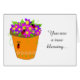 En blomkruka som flödar över med växter, ladybuggar som kryper på den. Lägg till ett eget meddelande som du vill anpassa.