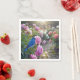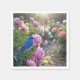 En ljus blåfågel satt på en peonia i en frodig trädgård full av färgglada blommor, när solljus strömmade genom, vilket förstärkte de livfulla färgerna