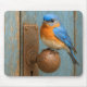 En liten blåfågel med vibrerande blått och orange-rörmobbning på en gammal, rostig dörrknapp