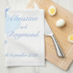 Det grå paret av färskefågel i teckning på en öppen fågelburk som hänger från ett blommande vår träd med hjärtan. Fashionable modern chic bröllop utformar en del av fågelburens romantiska bröllop stationära uppsättning. Redigera den här minnesdagen för kökshandduken i bröllop med din brud och brudgumm namn och speciella bröllop. Perfekt för en underbar unik keepsakpresenten till paret lycklig eller bara för att hedra minnet av er speciella dag. Unik teckning och utformning av Sarah Trett. www.mylittleedenweddings.com