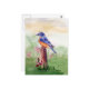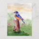 Från en ursprunglig vattenfärgsmålning av Brenda Thour av en vacker blåfågel sitta på en post i blues, gröntar, orangar, med stänk av rödblommor vid postens botten. Copyright by Brenda Thour 2009.