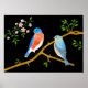 På en slank gren under rosa vårblommor sitter två blåmesar tätt ihop. Hanen är slående och livfull, hans fjädrar rika på färg - livfull, djupblå fjäderdräkt på huvud, rygg, vingar och stjärt, kontrasterad av en rik kastanjebrun eller tegelröd färg på strupe och bröst. Hans buk är vit,