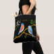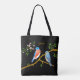På en slank gren under rosa vårblommor sitter två blåmesar tätt ihop. Hanen är slående och livfull, hans fjädrar rika på färg - livfull, djupblå fjäderdräkt på huvud, rygg, vingar och svans, kontrasterad av en rik kastanjebrun eller tegelröd färg på strupe och bröst. Hans buk är vit,