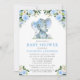 Vattenskärtad blå vit Blommigt Baby Elephant med en blå babyskabinbjudan. Omfattar vackert vattenfärgsblått ro, vita blommor och botaniskt grönt. Blått och Silver.