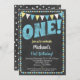 En funky-kritblått och gult-födelsedagsinbjudan med kylig krittext överst med kritbordsbakgrund, flaggor och en söt polka-punkt-gräns.