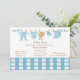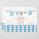 Starta din firande med den här snygga duschinbjudan. Den har ett blått och vitt incheckat grund med vit topp. Det finns en klädlinje som hänger över toppen med en rosa klänning och rosa barnkläder och en söt nalle. Anpassa med din information. ©JW Illustrationer