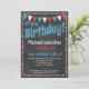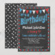 En funky-färgad och blå födelsedagsinbjudning med den tjocka texten "Det är en födelsedag!" överst med kritbakgrund, flaggor och en söt polka-punkt-gräns.