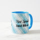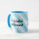 Denna tvåtonsbild mugg är ett fototryck av himlar blå som sitter över vitt. Insidan som visas i blått i himlar med blått handtag i himlar. Text i skriften "Inte förstörd bara välsignad" på båda sidor om mugg. Anpassa till dina önskemål eller köp som det visas. lagrar-bild www.freepik.com