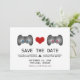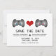 Den här Cute Gamer Spara datum meddelande med en-videospelsstyrenhet med blå knappar och en med rosa-knappar är en Quirky-chic som är helt fantastisk. Ett hjärta i mitten förbinder de två styrenheterna. Den här nerdalen sparar datuminbjudan som perfekt för spelparet. Enkel att anpassa, lägg bara till information om bröllop. Klicka på Anpassa om du vill söka efter fler anpassningsalternativ.
