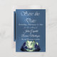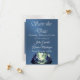Vattenfärgsberg Spara datumen har stora vattenfärgsberg i blått och grönt på en blå satängbakgrund med platshållare för informationen. Rum för ett foto av paret finns på baksidan av kortet. Om du vill ändra information klickar du på "Anpassa". Om du vill flytta texten eller ändra texten storlekt, teckensnitt eller färg klickar du på "Klicka för att anpassa ytterligare"