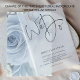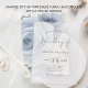 Dusty Blue Blommigts Background för Vellum. Vackra blå och vita blommigtar i bleken för en vacker bakgrund för en velluminbjudan. Det finns en opacitet lagrar ovanpå blommorna, så texten på velluminbjudan visas när den placeras ovanpå kortet med fotot. Du kan ta bort opaciteten lagrar om du vill. Du kan välja mellan de olika inbjudningarna till ställe ovanpå kortet med den här illustrationen av blommigten för att köpa separat i den här samlingen. Byt ut exempelfotot på baksidan med en egen favorit. Om du lägger till din QR-kod på din bröllop-webbplats på baksidan blir det här ett bekvämt alternativ för dina gäster till OSAN och du kan se alla detaljer utan att du behöver separata OSAS- och informationskort. Din QR-kod genereras automatiskt för att uppdatera exempelkoden i designen, när du bara ändrar exempel-URL:en i mallen med din egen URL för bröllop-webbplats.