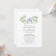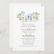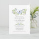 Blåfärgad bröllopsinbjudning med handmålade vattenfärgade blommor och små löv i blommigten.