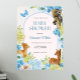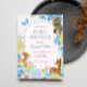 Blåa vattenfärger, söta djur och blommor, inbjudan till babydusch. Anpassade mörk grått och blå typografi på ljus rosa bakgrund.