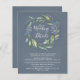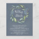 Utformningen har en tryckt vattenfärgad stålblå eller djup dammig blå bakgrund med en eucalyptus-krans som dekorerats med blad (fern, osv.) och botaniskt inslag i guld, skuggor av grönt och blues. Baksidan har samma vattenfärgsblå bakgrund. Vit typografi i elegant används inom och under andedräkten. Du kan lägga till ytterligare information på baksidan - anvisningar, annan information och mycket annat.