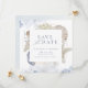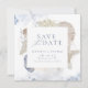 Eleganten under havets temainriktade strand sparar datumkortets kännetecken dammig blå vattenfärgskoral och seashells ram, snyggtens skript och typsnittsinformation, modern och romantisk, underbar för havets tema sommarbröllop, vintertropisk destinationsbröllop, kusthavets temed bröllop. Visa alla matchande delar i samlingen.