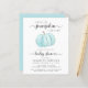 En söt, glad och budgetvänlig duschinbjudan i pojke med texten "En söt liten Pumpkin är på väg" skriven i en blandning av mjuk grått, modern typografi och snyggt, och en pastellblå vattenfärg av en pumpa. Du kan anpassa mor namn och duscha detaljer i enkel grått-typografi.