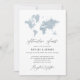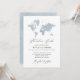 Blåfärgat världskartor för bröllopsinbjudan. Med en vacker blå handmålad vattenfärgsvärldskarta och vacker manusext. Perfekt för utlandsort bröllop eller resande älskare.