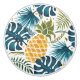 En stor gyllene ananas på en blå och grönt färgad handflatan träd lämnar löv mönster.