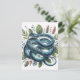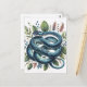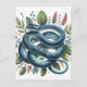 Det här vykortet har en vattenfärgsmålning av en kokt blå orm. Ostskalorna är mycket detaljerade och visar en övertoning med blå nyanser med färgnyanser av vita och mörkare nyanser, vilket ökar djup och realism. Dess slimmade kropp är konstnärligt placerad mitt i en lush arrangemang av grönt och botaniskt inslag, inklusive löv och små, ömtåliga blommor i muterade toner av grönt, blått och ärftligt . Sammansättningen balanserar ormens flytande, dynamiska form med det mjuka, naturliga inslag och skapar en harmonisk och påfallande (hehe) visuell effekt.