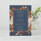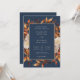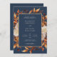 Bröllopsinbjudan till Blommigten för marint blåfall. Den här inbjudan från elegant bröllop innehåller vackra, handmålade vattenfärger, bränd orange och terracotta löv, kräm och beige dahlias, och vacker rost och brunt ro på vit bakgrund, perfekt i höst bröllop! Baksidan av inbjudan har ett vackert gren av löv med briden och brudgummens monogram. Sök efter matchande objekt i Bröllop-samlingen för marinblå höst Romantik.