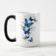 Flygande blå Butterflies morpho och vita fjärilar på en ljus abstrakt bakgrund. Morpho. Design med blå fjärilar morfin.