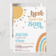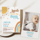 Blåfoto Retro Här kommer Sol:s första födelsedag Retro stil här komen på sol-födelsedagsinbjudan med en stil-typsnittsrubrik, sol, regnbåge och din lilla pojkes foto på baksidan. Den här pojkens första födelsedagsinbjudan är perfekt för någon som tittar för en första födelsedagsinbjudan till stil för pojke.