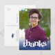 Se till att din favoritgrad visar uppskattning för alla som stödde deras milstolpe-händelse! Skicka ut det här fantastiska, enkla, moderna, platta personligen-fototack som du tycker om vykortet. Fet, grafik, vit typografi och en marin blå gradering täcker över ett foto som du väljer. Anpassa anpassningsbarna till namn och klassår. Lägg till en personlig på baksidan i mjuk grått-typografi, under marinblått lock-ikonen. Garanterade att deras korrespondens fick en extra snyggt! Det finns även matchande meddelanden, adressetiketter, varv, banderoller, toppar, servetter, tallrikar och andra studenten-varor i detta trendig och i insamlingen av eleganter. Garanterad att lägga till roligtar till snyggten vid deras särskilda tillfälle! Byt bara ut fotot mot ett av dina egna och skriv in namn och klassår för din grad, och du kan enkelt anpassa det här studenten-tacket som du vykort för. Lägg till en anteckning och returadress på personligen på baksidan. Var snäll och meddela mig med eventuella frågor eller förfrågningar.