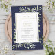 En elegant personlig firande av en inbjudan till livstidsminnen som innehåller botaniska vattenfärgsgrönt löv på en marin blå bakgrund. Designad av Thisisnotme©