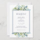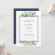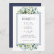Inbjudningskortet för stenning och elegant bröllop har en typografisk snyggt med ett vackert vattenfärgsblad i löv. Det blå färg-temat förs in på kortets baksida. Det här biet på bröllop-kontoret är redot för dig att anpassa dig efter detaljerna på din speciella dag. En del av en ständigt växande samling.