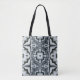 Ett berikat blått-grått-geometriskt mönster dekorerar denna totepåse.