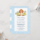 Vem gör inte kärlek hundar och spädbarn? Den här inbjudan till hund-babyduschen är ett underbart val för hundälskare. Överst i inbjudan finns en gyllene dodle omgiven av färgfulla blommigtar som går ut på dig. Under hund annonserar texten "Vi lägger till i vårt paket!" roligten tillfälle till dina gäster. Ett sött blått gräns med vit tass avtryck och baby fötter omger texten. Grattis till din nyfödd bebis-pojke med den här söta, marionettduschinbjudan.