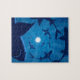 Det här pusslet har en undervattensbild som visar hajarna runt det vita måne som skakar genom vatten. Måne-strålarna tränger in i havets djup. Utformningen görs i blå nyanser. Underbart pussel för undervattensvärlden älskare.