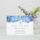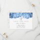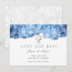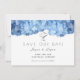Den ljusblå blommigten "spara our date" bröllop-meddelande med vattenblommor längs toppen. Vitkort har minimal text med utskrivet teckensnitt och stilar med skript. Två små hjärtan dekorerar överkanten och en vit blommigt dekorerar baksidan. Denna design finns också på de magnetiska korten vid BlueHyd.