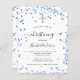 En modern, elegant, döpning, baptism, firande av pojke. En vit bakgrund med blå hjärtan och en gyllene kor. Anpassa och lägg till information om namn och party. Svart färgad brev.