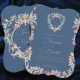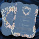 En opulent vintage, en tidsålder med bröllopsinbjudan. Med elegant ramade vapensköldar över namn och monogram. Skadblått med nyanser av blått lila och rosa som avspeglar nödtiderna. Vintage och elegant personligt bröllp design.