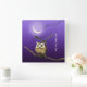 Ett brunt uggla med ljust öga sitta på gren under måndagsljus. Djupblå natten himlar, måne. Anpassat namn, kalligrafiskt teckensnitt. Uggla är en derivatteckning som bygger på en japansk vintage som tryckts på tidigt 1900-talet (inhyst på Rijksmuseum).