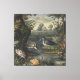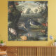 vintage av en botanisk scen med blå kranar vid en flod omgiven av vackra stora blommor