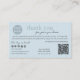 Blå minimalistisk och modern QR-kod för skript - Tack för att du kort för företag lägger till den här snyggten tack för att du kortar dina kundorder för en varm beröring. Visa din uppskattning och gör förpackningen ljusare med en mjuk blå design och modern text. Anpassa den genom att inkludera en speciell kupongkod för att uppmuntra till upprepade köp. Lägg till dina medieprofiler för logotyp och social för att hjälpa kunderna att hålla kontakten. Ta med webbplatslänken i QR-koden för enkel åtkomst. Hjälp till att bygga starka kundrelationer och göra ditt varumärke minnesvärt.