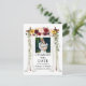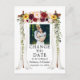 Blommigt för elegant bröllop Canopy Watercolor Burgundy Marsala Ändra Datumkort för Bröllop-senareläggning av ny Bröllop omfattar även burgundisk ro, rosa ros, röd ros och solblommor. Träets kanopy-båge i bröllop omfattar botaniskt grönt. Ett foto.