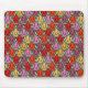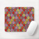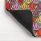 Den här musknappen har en konsdeco-design av tulpaner från pentagoner och trapezoider i orange, rött, lila, guld och grönt.