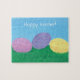 De här pusslen har min målning av tre Påskägg som ligger i gräset. Äggen blandas, det finns en rosa, lavender och gult. Himmel är blek blå och texten, Glad påsk, är skriven över himmel i vitt. Det är enkelt att anpassa texten i mallformuläret. Tack för att du shoppade CherylsArt på Zazzle.