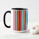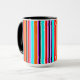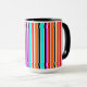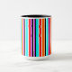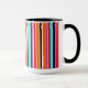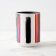 Mugg har en enkel utformning av lodrät rand med varierande tjocklek i rött, orange, lila, svart, ljusblått och vitt.